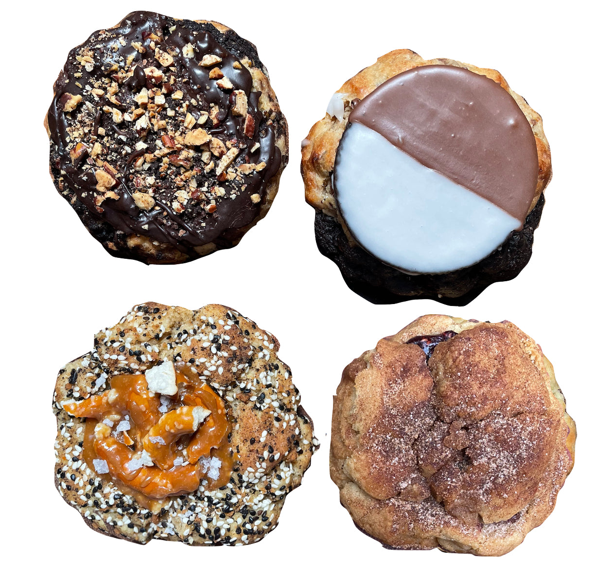BF everything cookie: brown butter cookie base + rolled in crumbs of biscoff, oreo, graham cracker, black & white sesame seeds- topped with pretzel pieces & housemade caramel