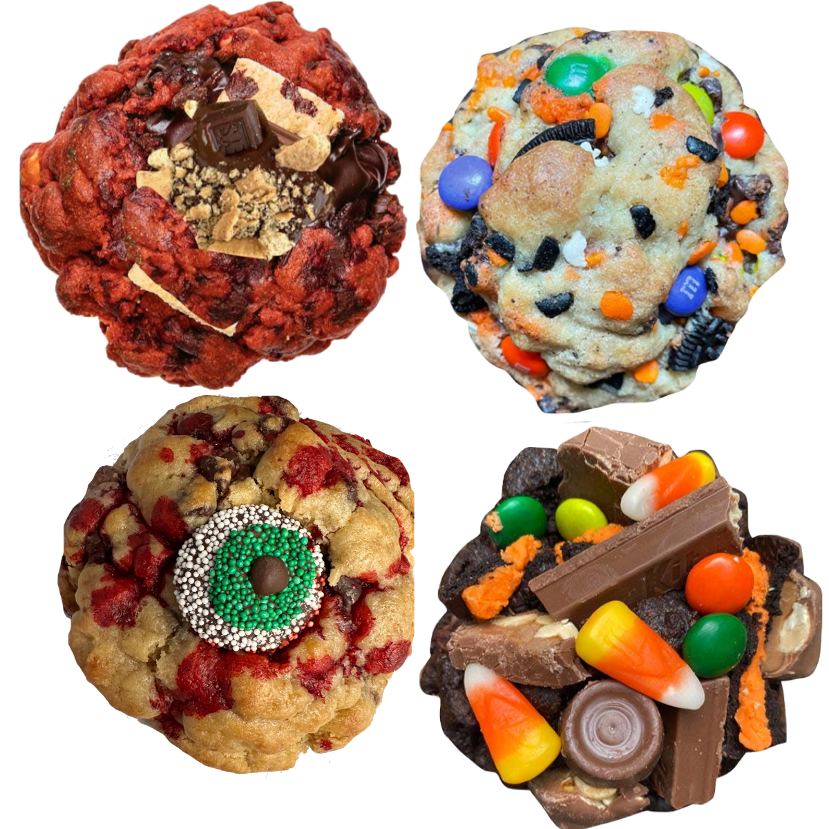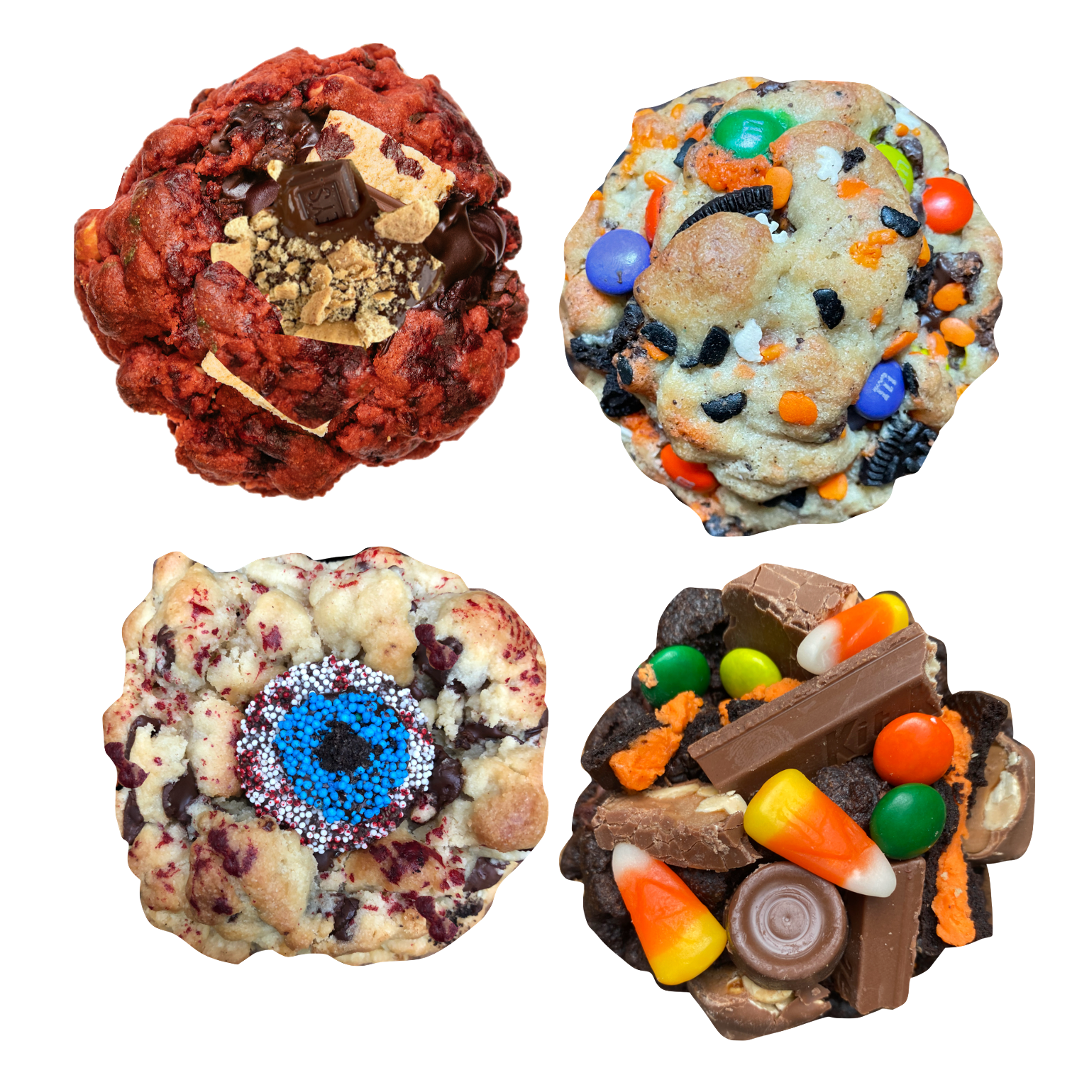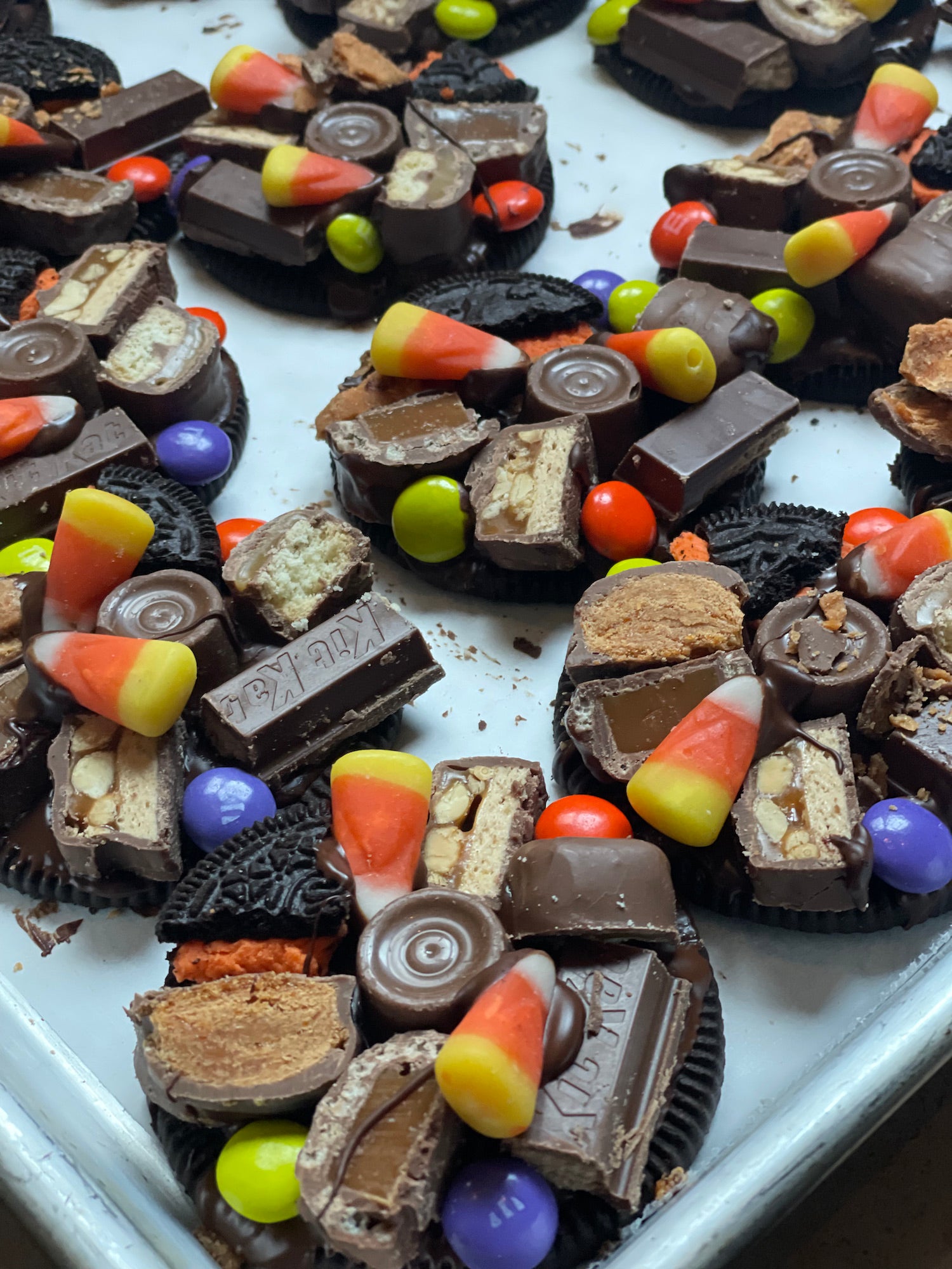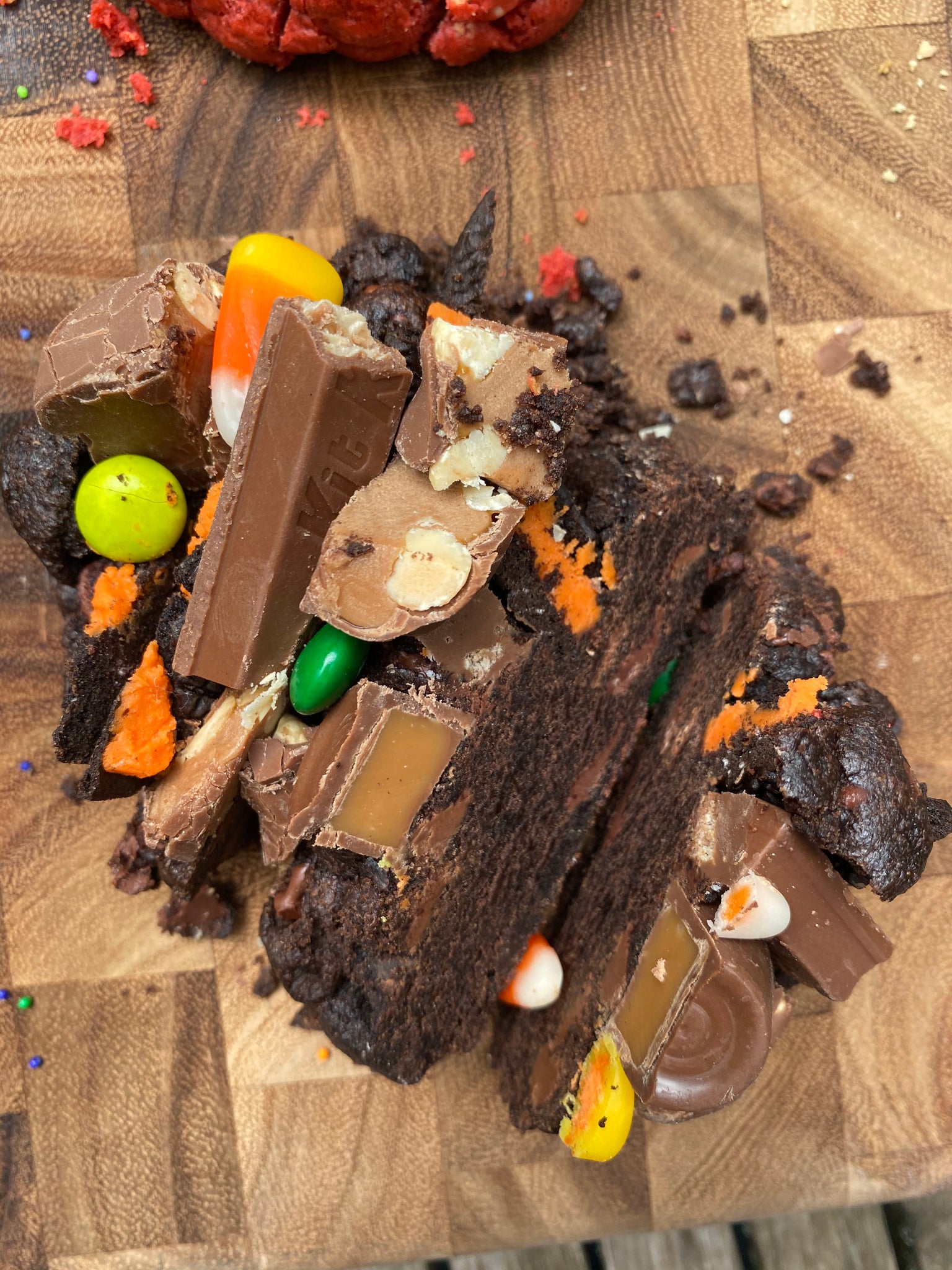 halloween town: quadruple chocolate chip cookie with our favorite halloween candy { bakers choice} nothing gross (no black licorice, orange marshmallow peanuts, jujubes or good&plenty!!!)