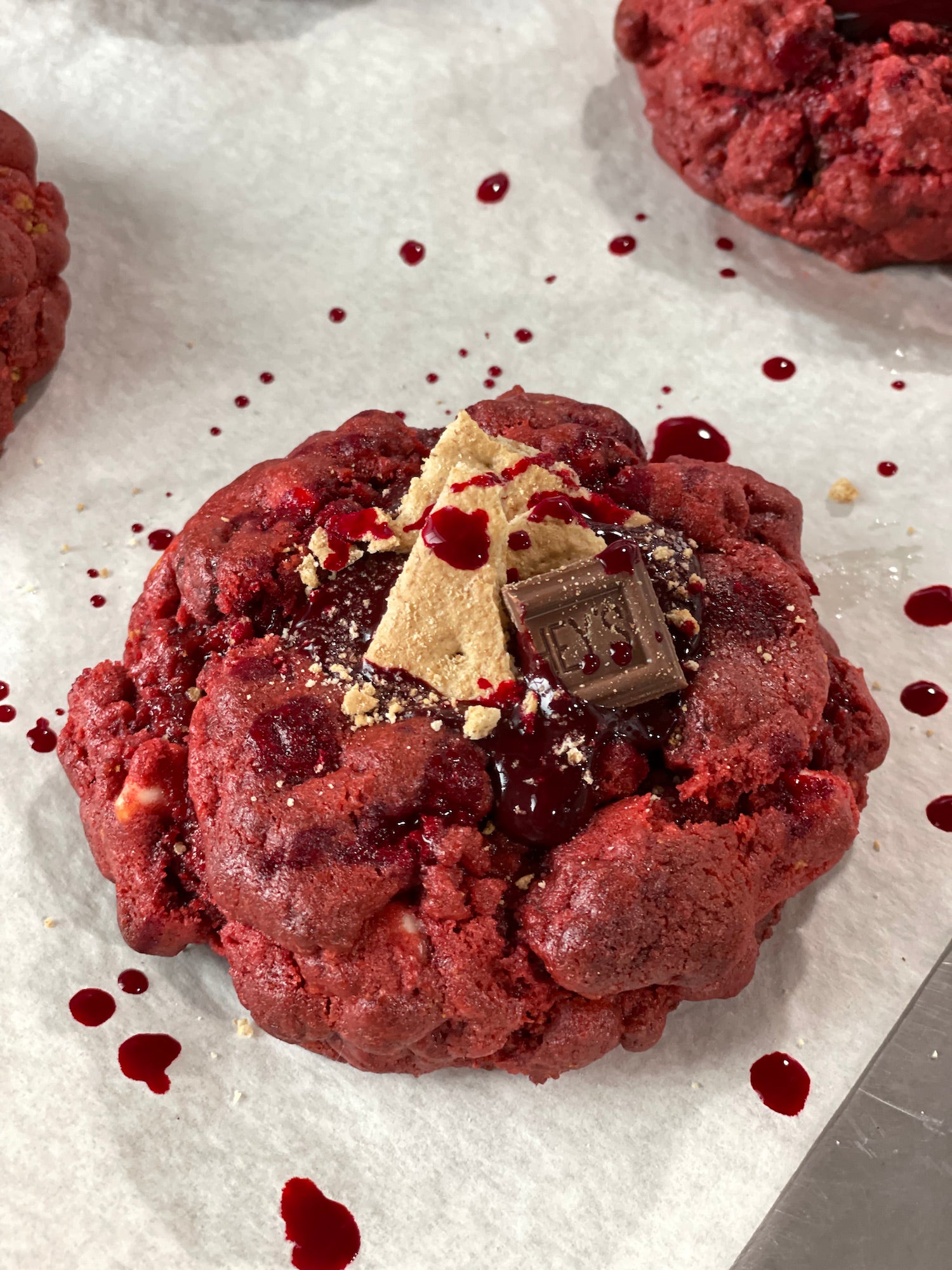 red velvet s'mores: red velvet cookie + white & semi sweet chocolate chips, marshmallow+ bloody red chocolate glaze+s'mores stuff